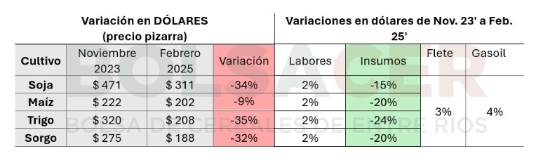 Tanto en los principales cultivos —maíz, trigo, soja y sorgo— como de sus respectivos costos asociados en la producción —labores, insumos, gasoil, flete—, y con el objetivo de cuantificar la pérdida de poder de compra en cada caso, la Bolsa de Cereales de Entre Ríos (BolsaCER), en colaboración con la Facultad de Ciencias Económicas de la UNER, presentó un informe donde se analiza la evolución en pesos desde noviembre 2023 a febrero del corriente año.